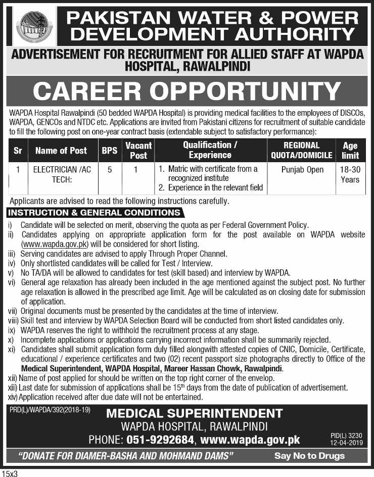 Employment in WAPDA are named as (Electrician/AC Technician) and it is based at WAPDA Hospital Rawalpindi which should be filled right away. The arrangement will be made on contract reason for 0ne year which will be stretched out on tasteful execution of a person.