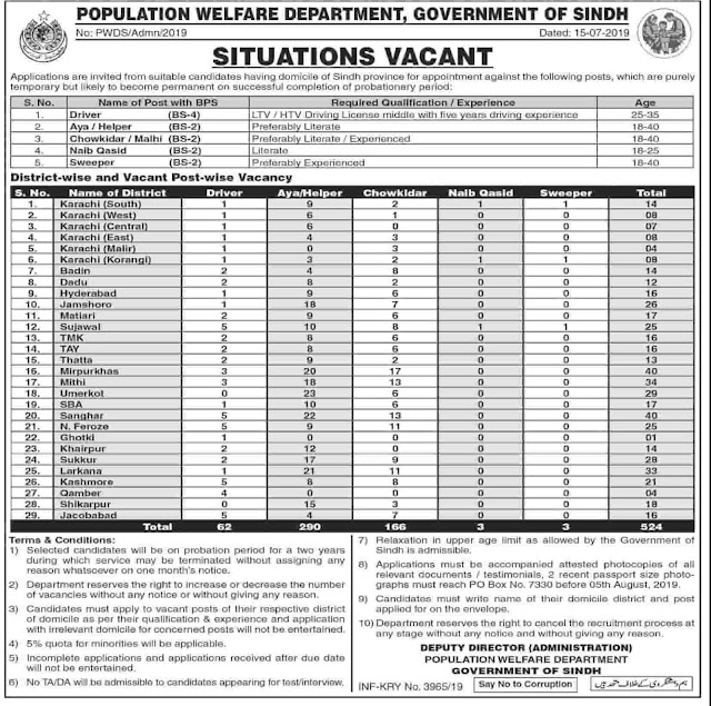 Population Welfare Department Sindh Jobs 2019 For Support Staff