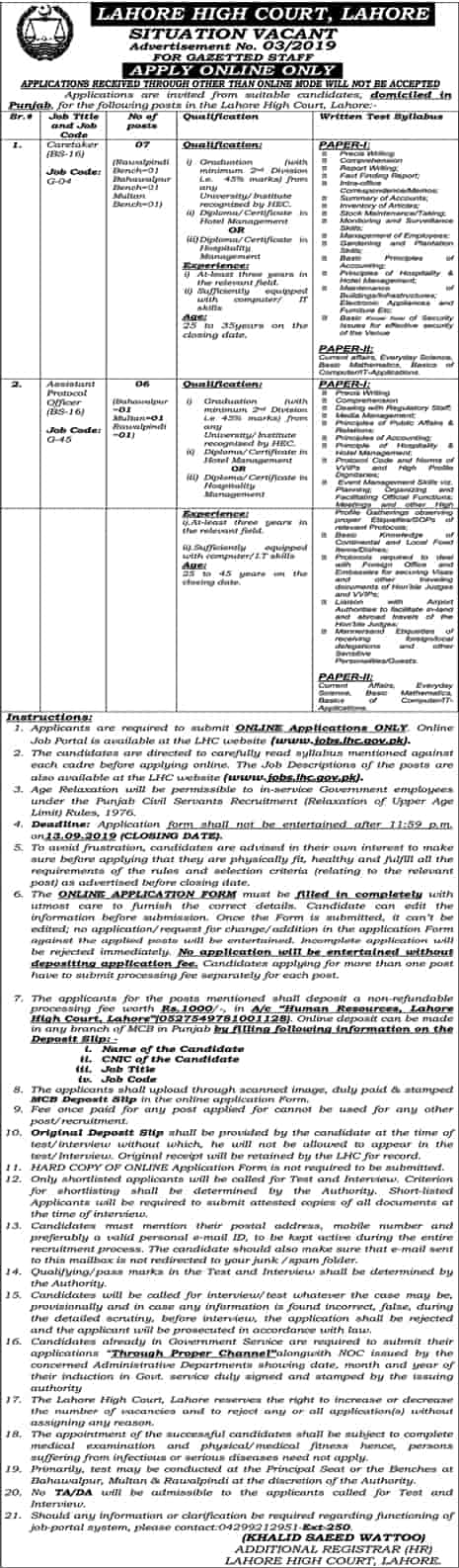 Lahore High Court jobs 2019 Latest Advertisement Apply Online