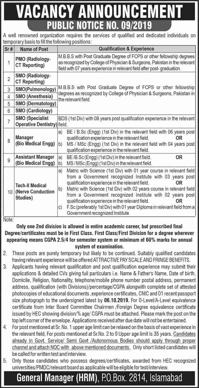 - Interested candidates may send their applications along with attested photocopies of educational certificates, experience certificates, CNIC, Domicile and fresh passport size photographs to address P.O. Box 2814, Islamabad.