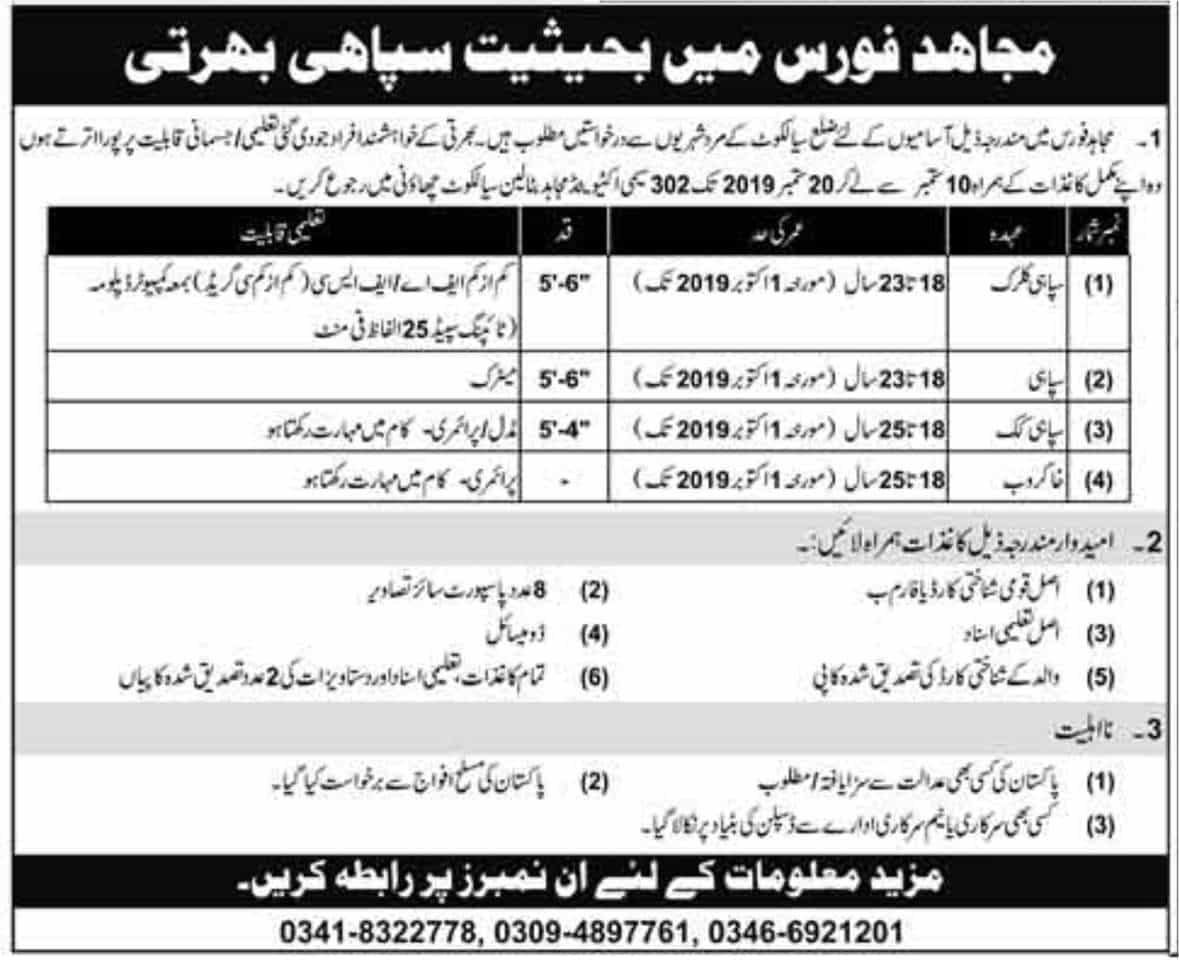 Stay this page to read about Pak Army Mujahid Force Jobs 2019 as Siphai/ Join Pak Army Mujahid Force Latest Vacancies has been announced today. Applications are invited from well-disciplined, competent and hardworking candidates. A resident of District Sialkot are eligible to apply for Mujahid Force Jobs 2019 as Siphai. Following is the complete detail of this job read carefully and apply.