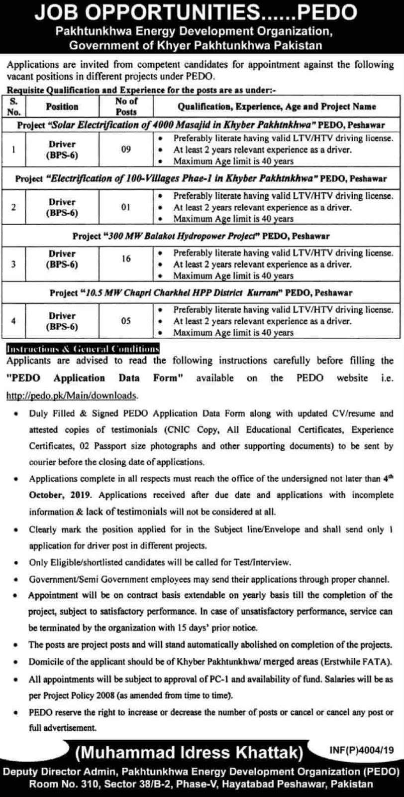 - Candidates must apply for PEDO Jobs 2019 before last date 4th October 2019.