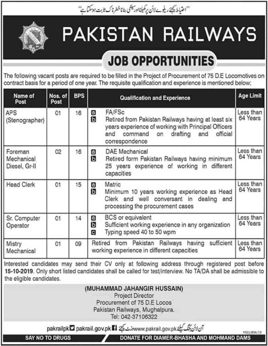 - To apply for Pakistan Railway Jobs 2019 candidates must send their applications along with attested photocopies of educational certificates, experience certificates, character certificates, domicile, CNIC, 03 fresh Passport size photographs to address Office of Project Director Procurement of 75 D.E Locos Pakistan Railways, Mughalpura Lahore.